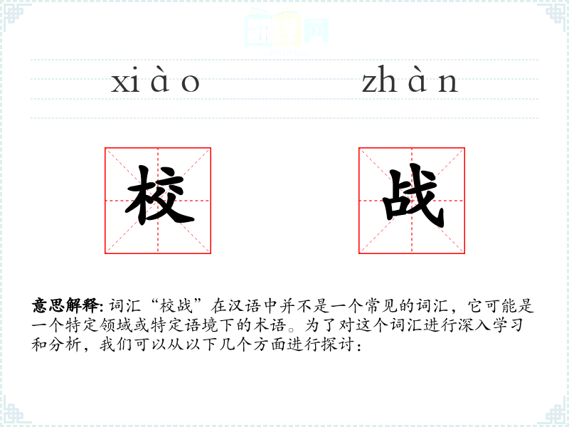 词汇“校战”在汉语中并不是一个常见的词汇,它可能是一个特定领域或特定语境下的术语。为了对这个词汇进行深入学习和分析,我们可以从以下几个方面进行探讨: