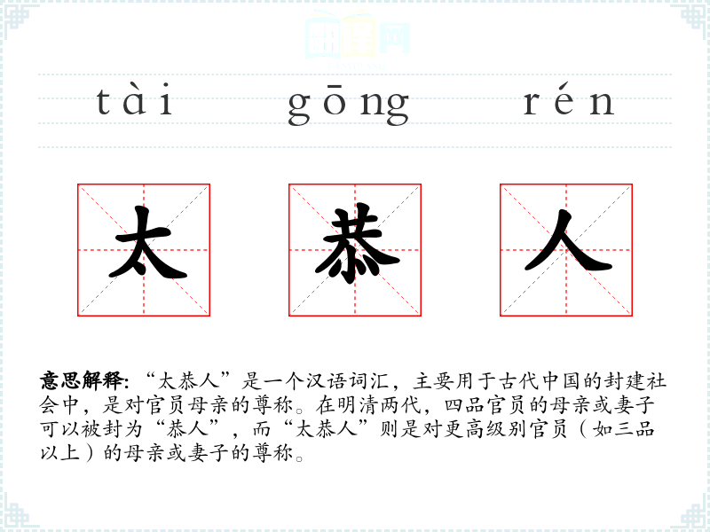 “太恭人”是一个汉语词汇,主要用于古代**的封建社会中,是对官员母亲的尊称。在明清两代,四品官员的母亲或妻子可以被封为“恭人”,而“太恭人”则是对更高级别官员(如三品以上)的母亲或妻子的尊称。