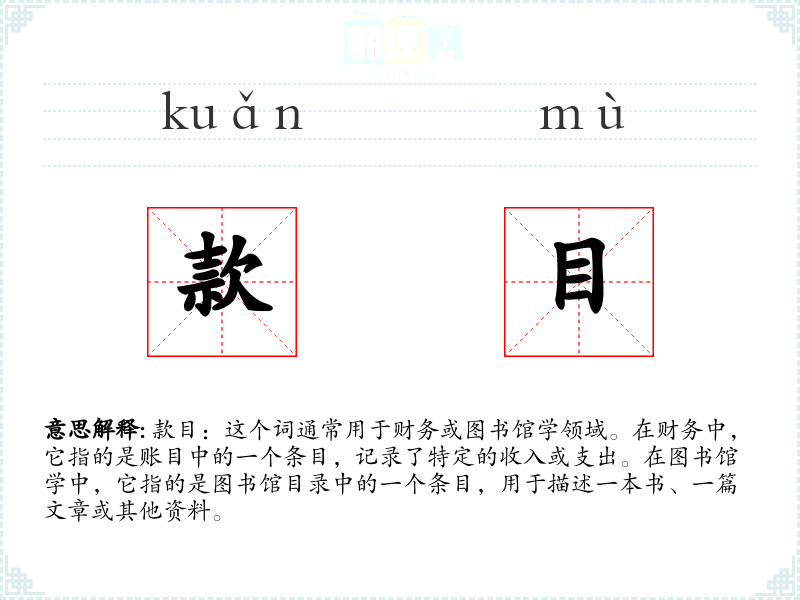 款目:这个词通常用于财务或图书馆学领域。在财务中,它指的是账目中的一个条目,记录了特定的收入或支出。在图书馆学中,它指的是图书馆目录中的一个条目,用于描述一本书、一篇文章或其他资料。