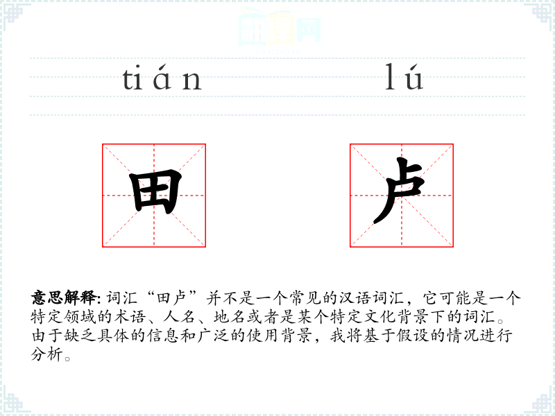 词汇“田卢”并不是一个常见的汉语词汇,它可能是一个特定领域的术语、人名、地名或者是某个特定文化背景下的词汇。由于缺乏具体的信息和广泛的使用背景,我将基于假设的情况进行分析。