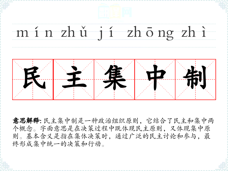 民主集中制是一种政治组织原则,它结合了民主和集中两个概念。字面意思是在决策过程中既体现民主原则,又体现集中原则。基本含义是指在集体决策时,通过广泛的民主讨论和参与,最终形成集中统一的决策和行动。
