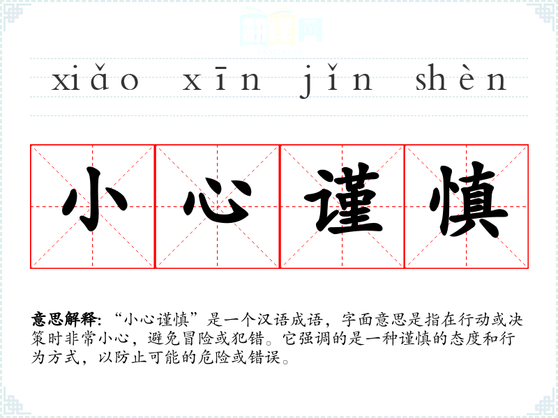 “小心谨慎”是一个汉语成语,字面意思是指在行动或决策时非常小心,避免冒险或犯错。它强调的是一种谨慎的态度和行为方式,以防止可能的危险或错误。