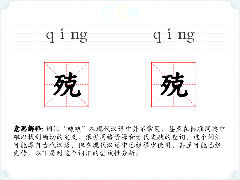 由于“殑殑”在现代汉语中缺乏明确的定义,我们只能根据字面意思进行推测。字面上看,“殑”可能与死亡、疾病或极度疲惫有关,而“殑殑”可能是形容词或副词,用来描述某种极端的状态或感觉。