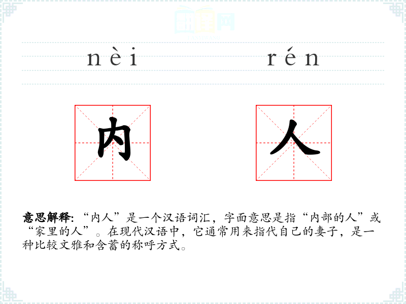 “内人”是一个汉语词汇,字面意思是指“内部的人”或“家里的人”。在现代汉语中,它通常用来指代自己的妻子,是一种比较文雅和含蓄的称呼方式。
