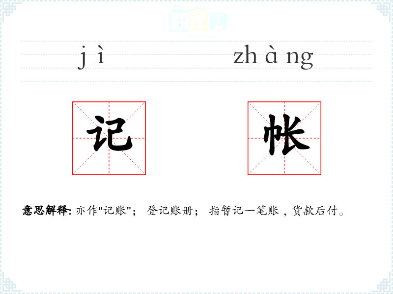 亦作"记账"; 登记账册; 指暂记一笔账﹐货款后付。