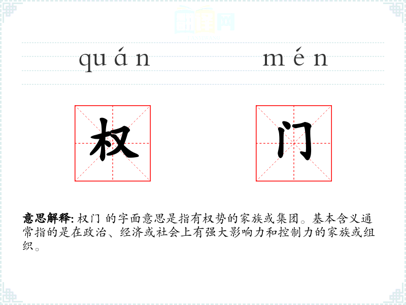 权门 的字面意思是指有权势的家族或集团。基本含义通常指的是在政治、经济或社会上有强大影响力和控制力的家族或组织。