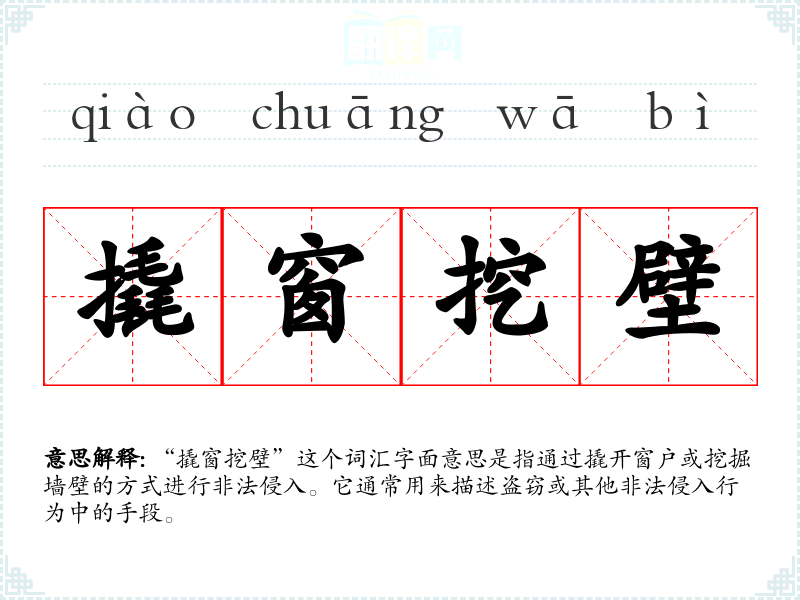 “撬窗挖壁”这个词汇字面意思是指通过撬开窗户或挖掘墙壁的方式进行非法侵入。它通常用来描述盗窃或其他非法侵入行为中的手段。