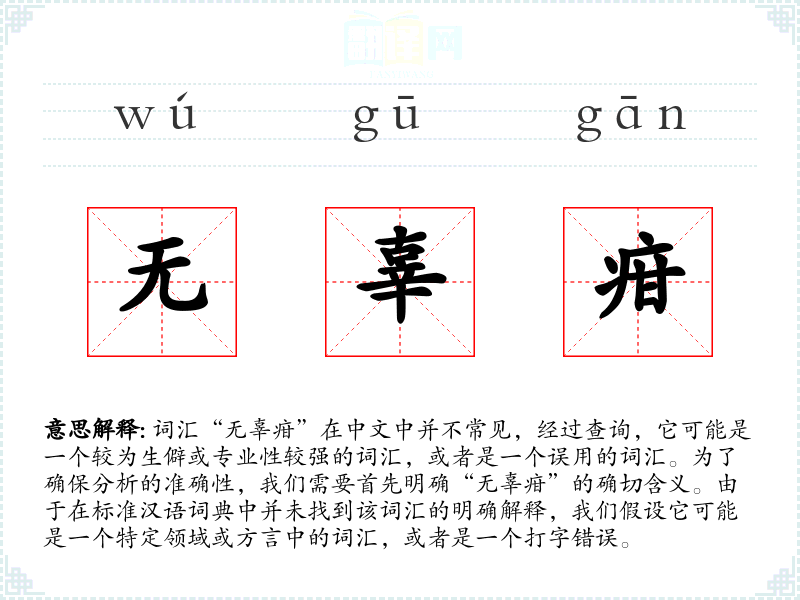 词汇“无辜疳”在中文中并不常见,经过查询,它可能是一个较为生僻或专业性较强的词汇,或者是一个误用的词汇。为了确保分析的准确性,我们需要首先明确“无辜疳”的确切含义。由于在标准汉语词典中并未找到该词汇的明确解释,我们假设它可能是一个特定领域或方言中的词汇,或者是一个打字错误。