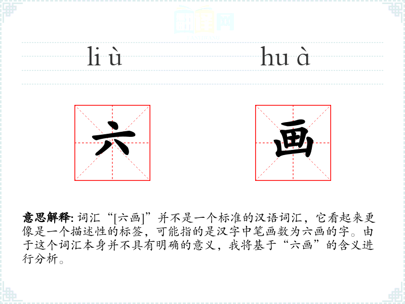词汇“[六画]”并不是一个标准的汉语词汇,它看起来更像是一个描述性的标签,可能指的是汉字中笔画数为六画的字。由于这个词汇本身并不具有明确的意义,我将基于“六画”的含义进行分析。