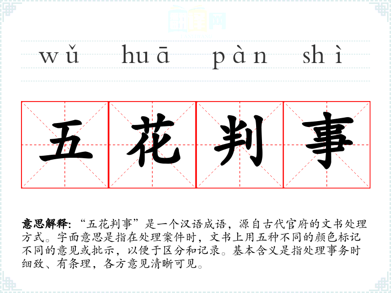 在文学作品中,“五花判事”常用来形容官员处理公务的细致和公正。在口语中,这个词汇可能不太常用,但在法律或行政领域,它可能被用来描述一种规范的文书处理流程。