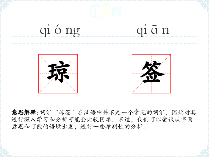 结合这两个字,“琼签”可能指的是一种用美玉制成的签,或者是一种非常精美的签。
