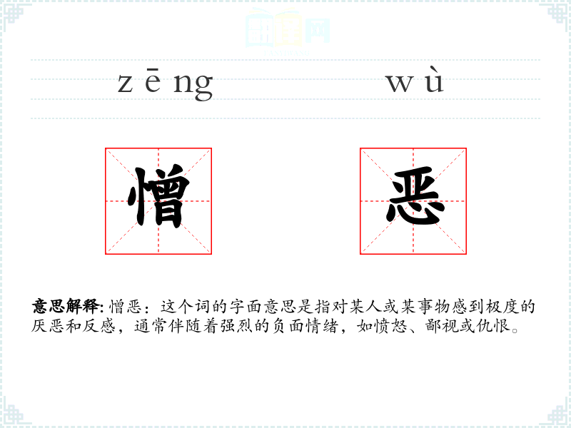 憎恶:这个词的字面意思是指对某人或某事物感到极度的厌恶和反感,通常伴随着强烈的负面情绪,如愤怒、鄙视或仇恨。