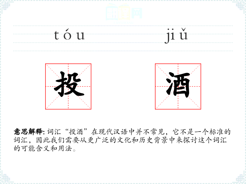 词汇“投酒”在现代汉语中并不常见,它不是一个标准的词汇,因此我们需要从更广泛的文化和历史背景中来探讨这个词汇的可能含义和用法。