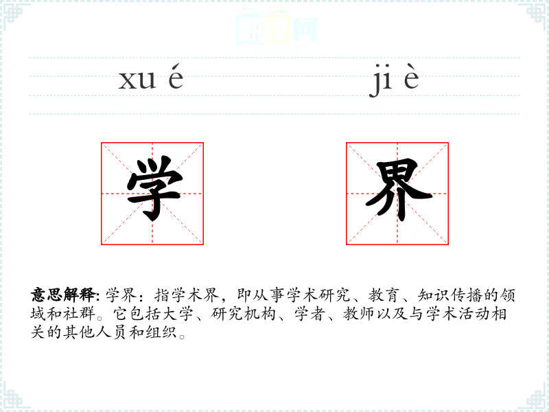“学界”一词由“学”和“界”组成,其中“学”指学*、学术,“界”指范围、领域。这个词在中文里历史悠久,但随着现代学术体系的发展,其含义和使用场景也逐渐丰富和专业化。