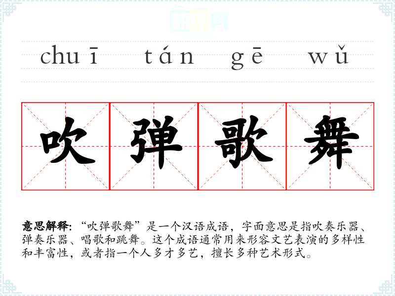 “吹弹歌舞”是一个汉语成语,字面意思是指吹奏乐器、弹奏乐器、唱歌和跳舞。这个成语通常用来形容文艺表演的多样性和丰富性,或者指一个人多才多艺,擅长多种艺术形式。