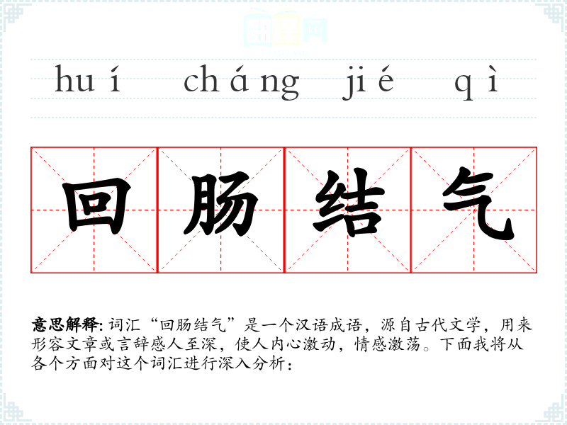 词汇“回肠结气”是一个汉语成语,源自古代文学,用来形容文章或言辞感人至深,使人内心激动,情感激荡。下面我将从各个方面对这个词汇进行深入分析: