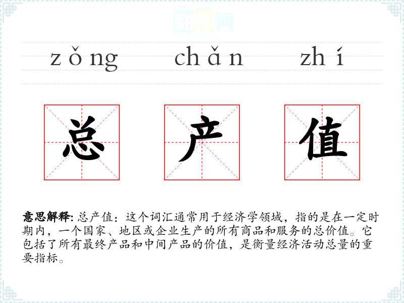 总产值:这个词汇通常用于经济学领域,指的是在一定时期内,一个国家、地区或企业生产的所有商品和服务的总价值。它包括了所有最终产品和中间产品的价值,是衡量经济活动总量的重要指标。