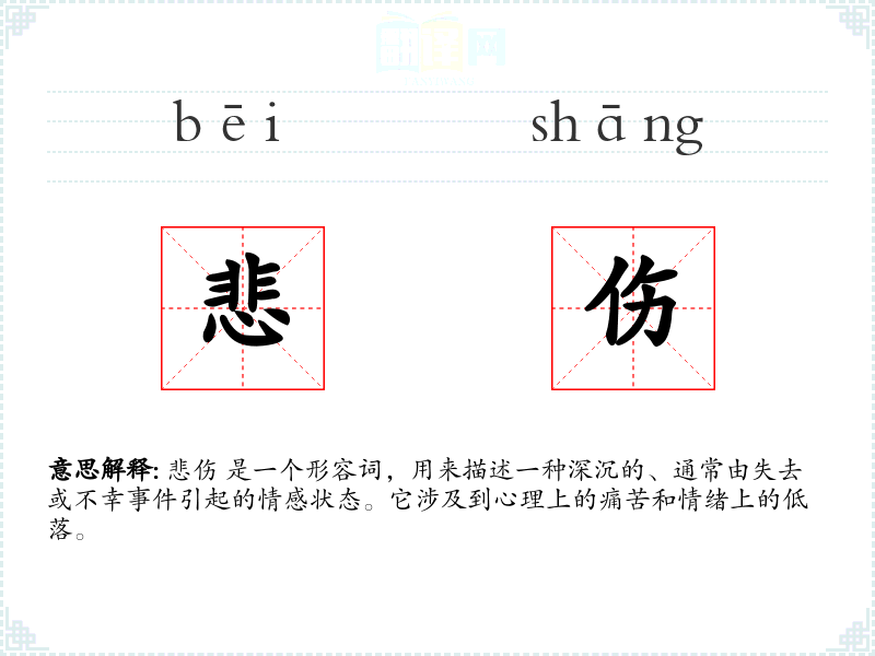 悲伤 是一个形容词,用来描述一种深沉的、通常由失去或不幸**引起的情感状态。它涉及到心理上的痛苦和情绪上的低落。