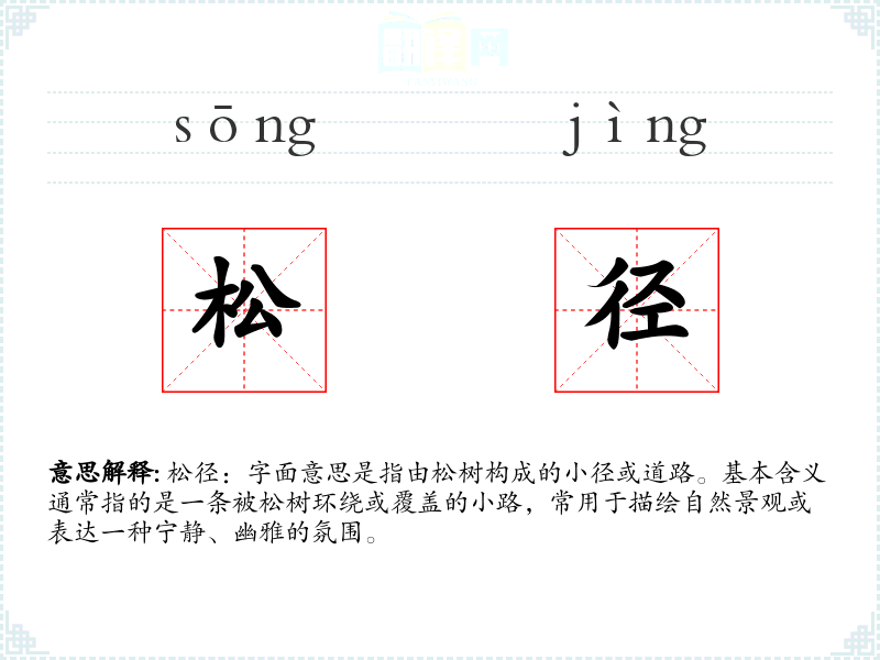 “松径”一词源于汉语,由“松”和“径”两个字组成。在古代文学中已有使用,如唐代诗人王维的《山居秋暝》中有“松径通幽处,禅房花木深”的句子。随着时间的推移,这个词在文学和日常语言中逐渐固定下来,成为描述自然景观的常用词汇。