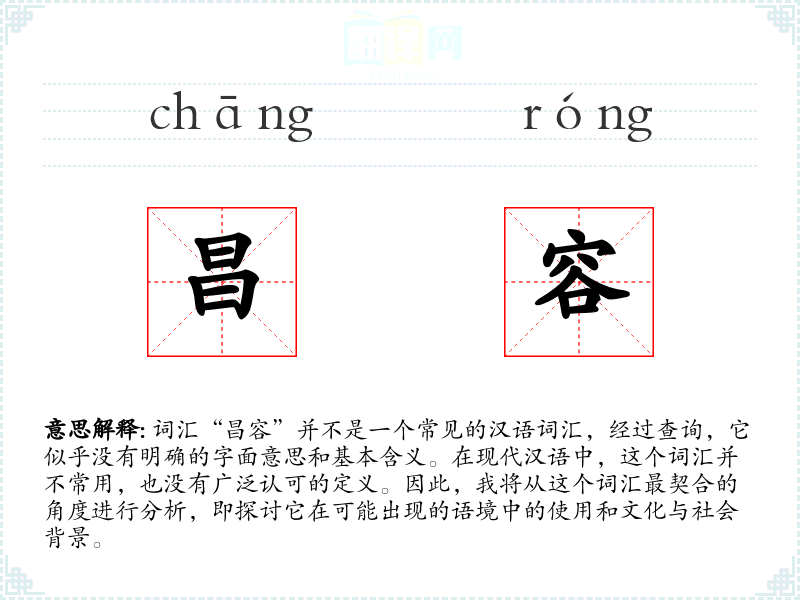 由于“昌容”不是一个标准词汇,我们无法提供一个确切的基本定义。它可能是某个特定领域或方言中的词汇,或者是某个特定人物或作品中的创造性用语。