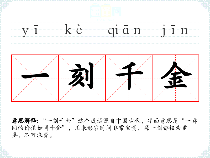 “一刻千金”这个成语源自**古代,字面意思是“一瞬间的价值如同千金”,用来形容时间非常宝贵,每一刻都极为重要,不可浪费。