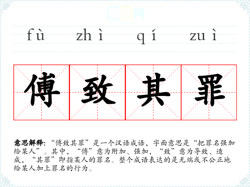“傅致其罪”是一个汉语成语,字面意思是“把罪名强加给某人”。其中,“傅”意为附加、强加,“致”意为导致、造成,“其罪”即指某人的罪名。整个成语表达的是无端或不公正地给某人加上罪名的行为。