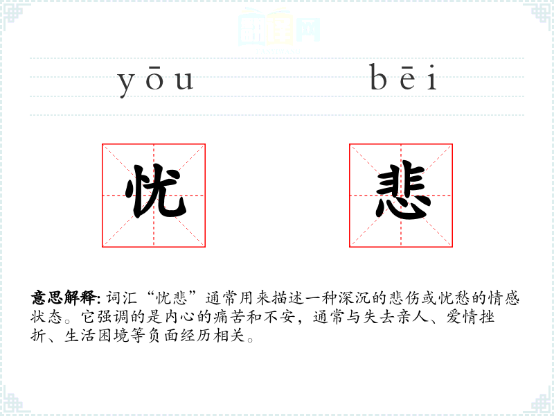 词汇“忧悲”通常用来描述一种深沉的悲伤或忧愁的情感状态。它强调的是内心的痛苦和不安,通常与失去亲人、爱情挫折、生活困境等负面经历相关。