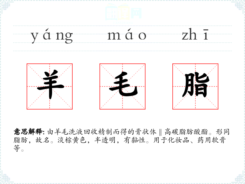 由羊毛洗液回收精制而得的膏状体‖高碳脂肪酸酯。形同脂肪,故名。淡棕黄色,半透明,有黏性。用于化妆品、药用软膏等。