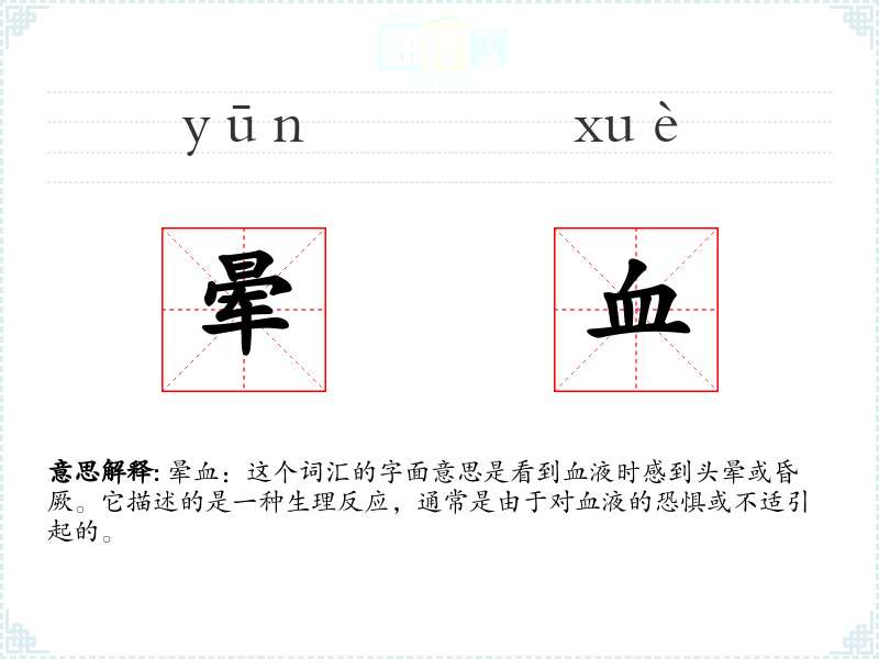 晕血:这个词汇的字面意思是看到血液时感到头晕或昏厥。它描述的是一种生理反应,通常是由于对血液的恐惧或不适引起的。