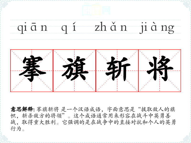 搴旗斩将 是一个汉语成语,字面意思是“拔取敌人的旗帜,斩杀敌方的将领”。这个成语通常用来形容在战斗中英勇善战,取得重大胜利。它强调的是在战争中的直接对抗和个人的英勇行为。