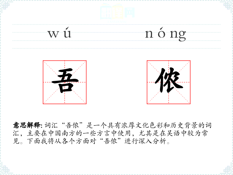 词汇“吾侬”是一个具有浓厚文化色彩和历史背景的词汇,主要在**南方的一些方言中使用,尤其是在吴语中较为常见。下面我将从各个方面对“吾侬”进行深入分析。