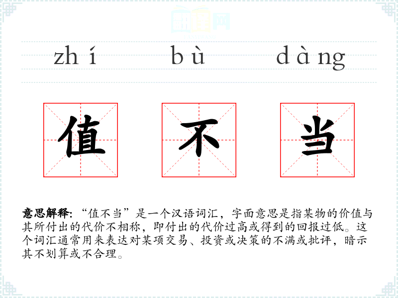 “值不当”是一个汉语词汇,字面意思是指某物的价值与其所付出的代价不相称,即付出的代价过高或得到的回报过低。这个词汇通常用来表达对某项交易、投资或决策的不满或批评,暗示其不划算或不合理。