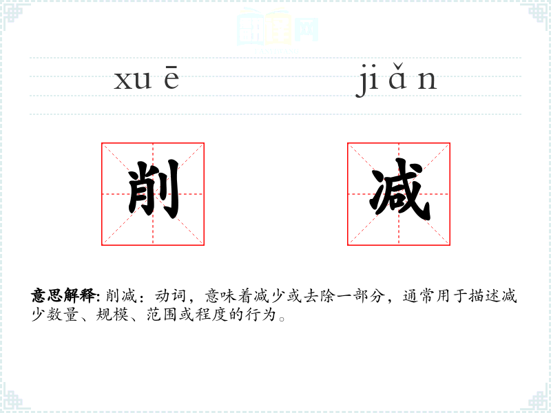 削减:动词,意味着减少或去除一部分,通常用于描述减少数量、规模、范围或程度的行为。