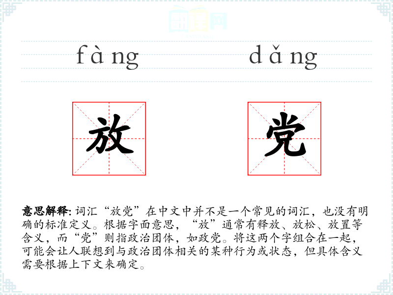 词汇“放党”在中文中并不是一个常见的词汇,也没有明确的标准定义。根据字面意思,“放”通常有释放、放松、放置等含义,而“党”则指政治团体,如政党。将这两个字组合在一起,可能会让人联想到与政治团体相关的某种行为或状态,但具体含义需要根据上下文来确定。