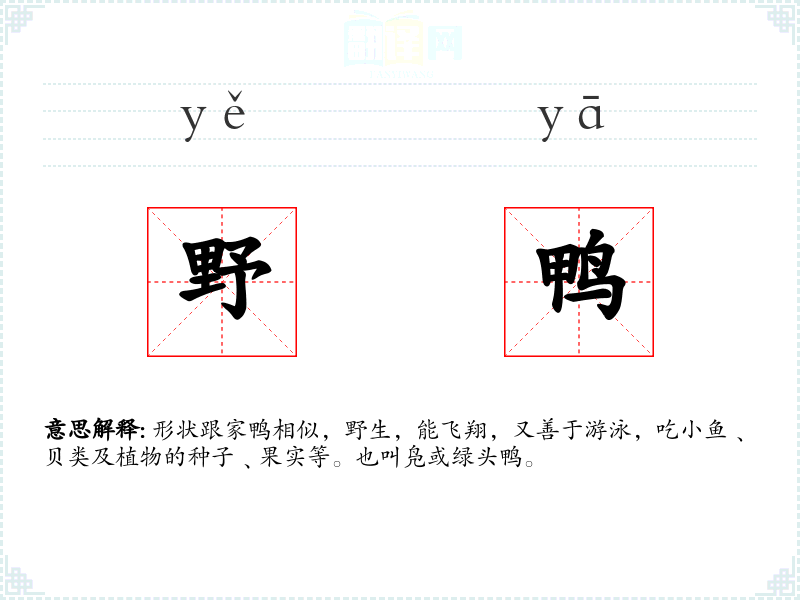 形状跟家鸭相似,野生,能飞翔,又善于游泳,吃小鱼﹑贝类及植物的种子﹑果实等。也叫凫或绿头鸭。