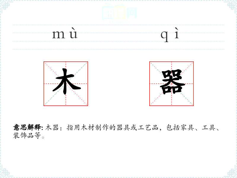 - 反义词:金属器具、塑料制品(这些材料制成的器具与木器形成对比)