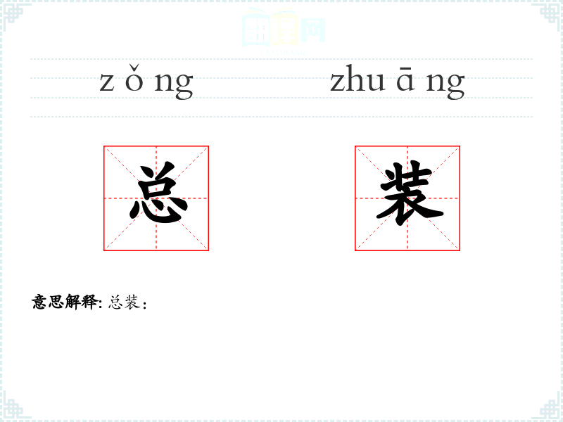 - 词源:“总装”一词由“总”和“装”两个字组成,其中“总”表示整体、全部,“装”表示装配、安装。