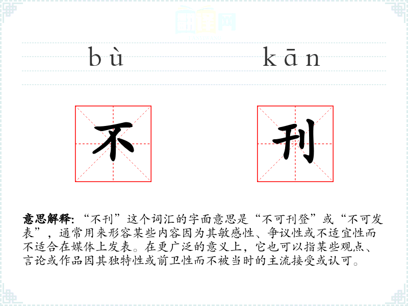 “不刊”这个词汇的字面意思是“不可刊登”或“不可发表”,通常用来形容某些内容因为其敏感性、争议性或不适宜性而不适合在媒体上发表。在更广泛的意义上,它也可以指某些观点、言论或作品因其独特性或前卫性而不被当时的主流接受或认可。