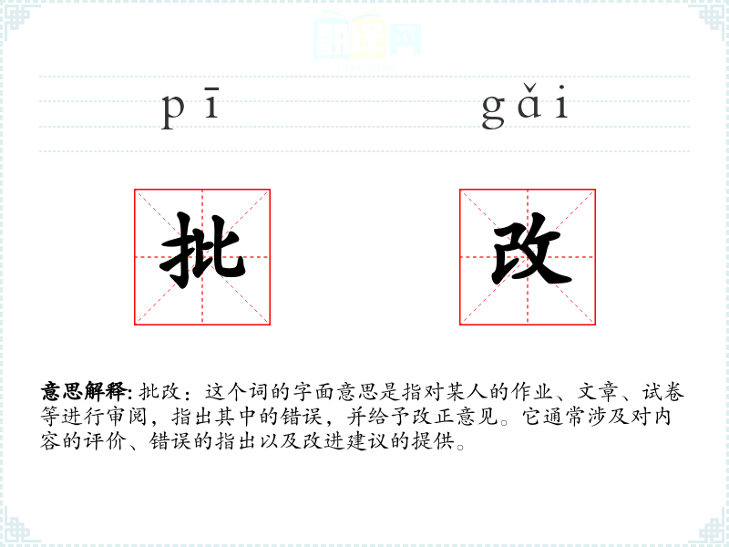批改:这个词的字面意思是指对某人的作业、文章、试卷等进行审阅,指出其中的错误,并给予改正意见。它通常涉及对内容的评价、错误的指出以及改进建议的提供。