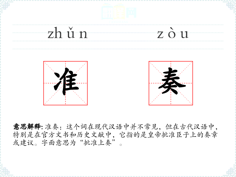 准奏:这个词在现代汉语中并不常见,但在古代汉语中,特别是在官方文书和历史文献中,它指的是**批准臣子上的奏章或建议。字面意思为“批准上奏”。