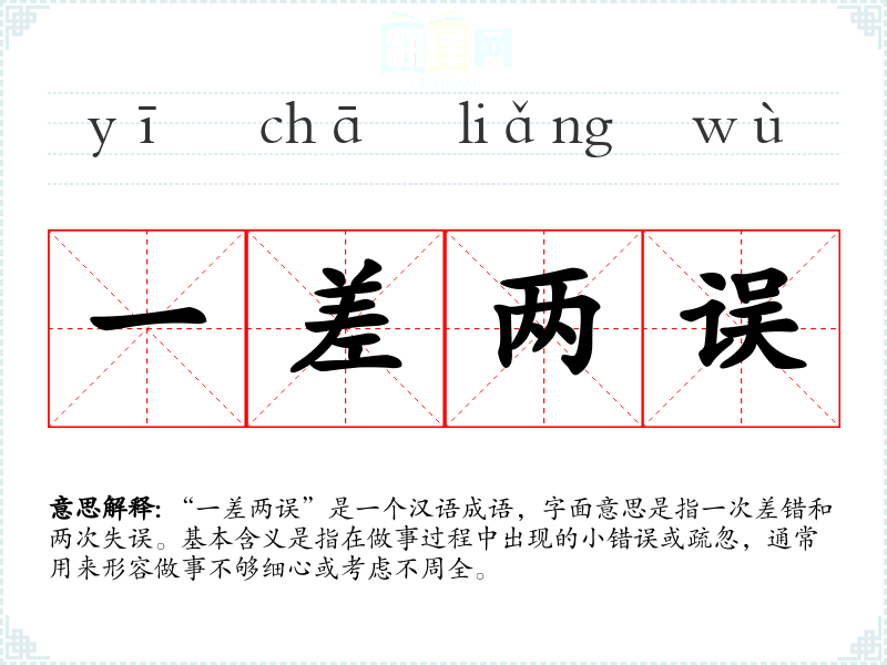 “一差两误”是一个汉语成语,字面意思是指一次差错和两次失误。基本含义是指在做事过程中出现的小错误或疏忽,通常用来形容做事不够细心或考虑不周全。