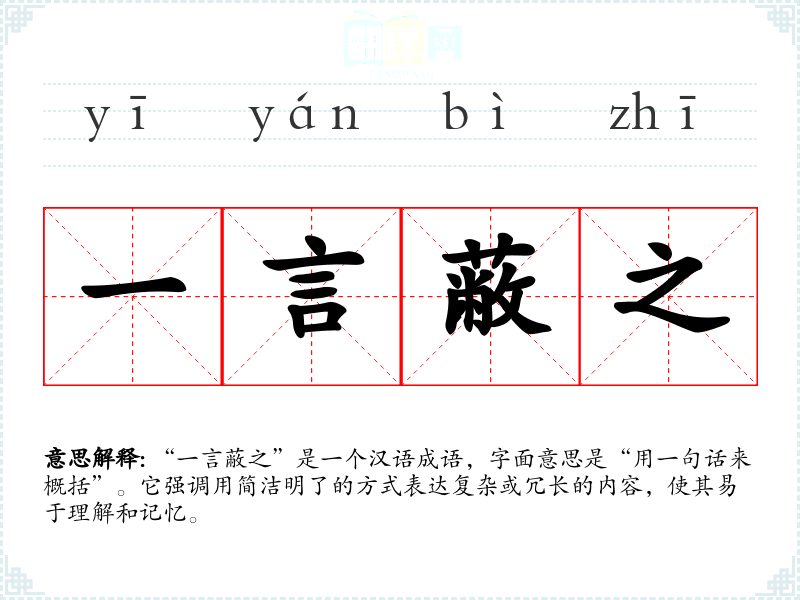 “一言蔽之”是一个汉语成语,字面意思是“用一句话来概括”。它强调用简洁明了的方式表达复杂或冗长的内容,使其易于理解和记忆。