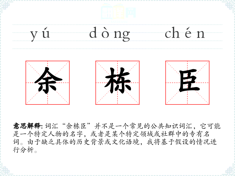 词汇“余栋臣”并不是一个常见的公共知识词汇,它可能是一个特定人物的名字,或者是某个特定领域或社群中的专有名词。由于缺乏具体的历史背景或文化语境,我将基于假设的情况进行分析。