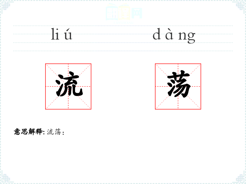 - 词源:“流荡”由“流”和“荡”两个字组成,“流”指流动,“荡”指摇动或波动,合起来表示不断移动的状态。