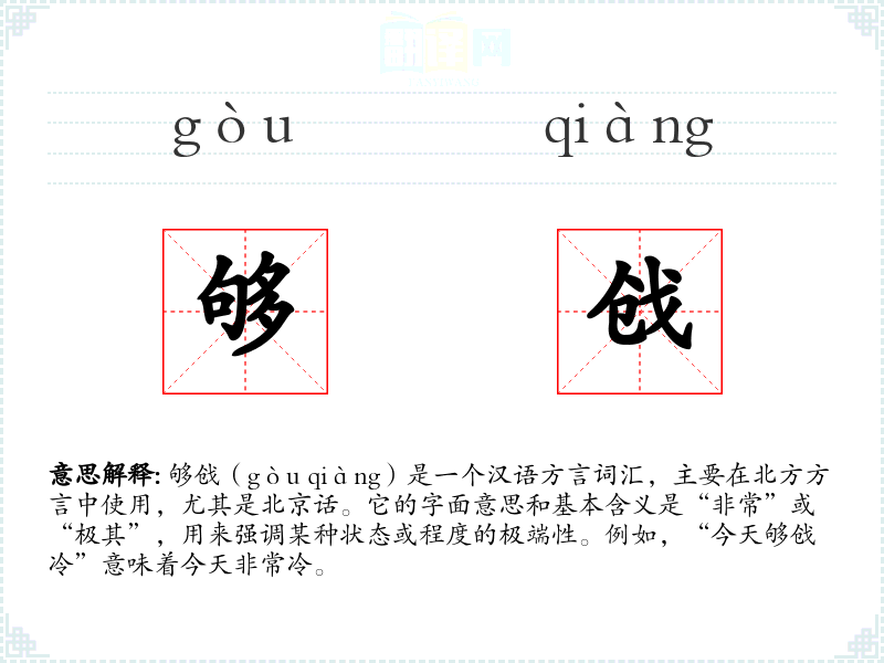 够戗(gòu qiàng)是一个汉语方言词汇,主要在北方方言中使用,尤其是北京话。它的字面意思和基本含义是“非常”或“极其”,用来强调某种状态或程度的极端性。例如,“今天够戗冷”意味着今天非常冷。