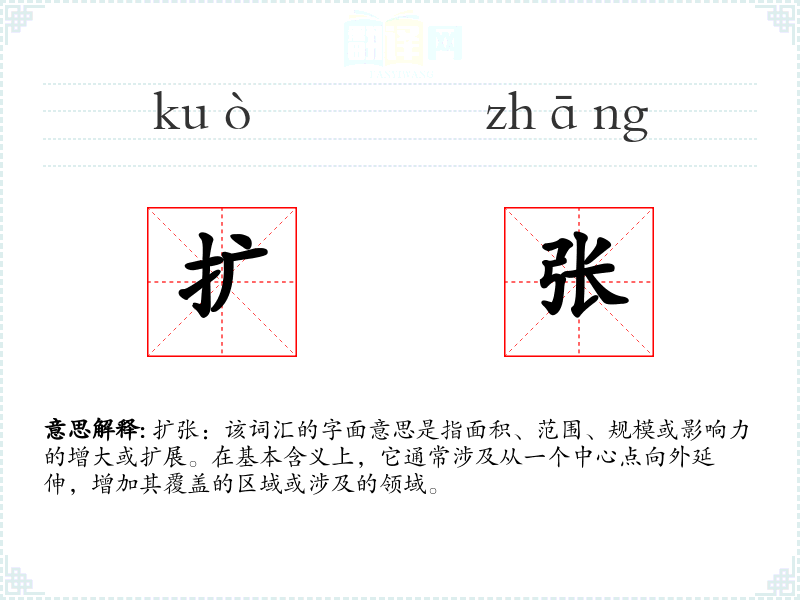 扩张:该词汇的字面意思是指面积、范围、规模或影响力的增大或扩展。在基本含义上,它通常涉及从一个中心点向外延伸,增加其覆盖的区域或涉及的领域。