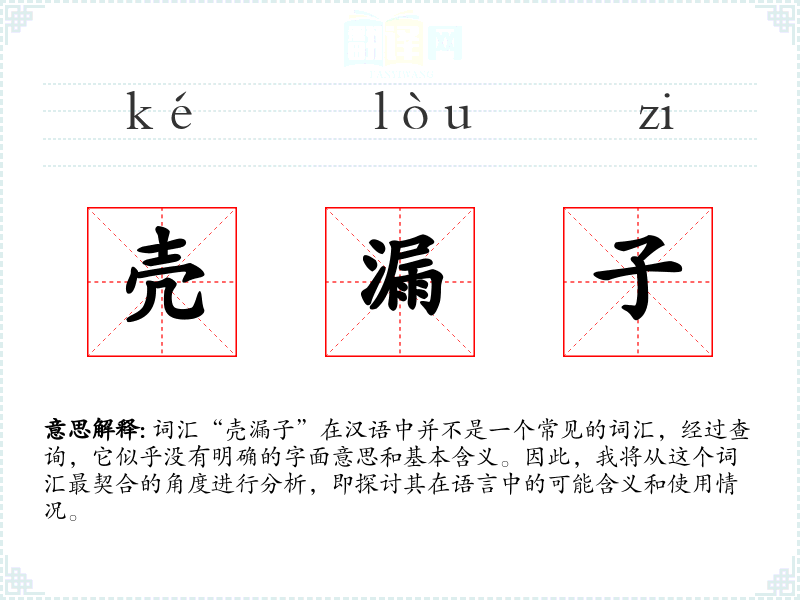 由于“壳漏子”不是一个标准词汇,我们无法给出一个确切的基本定义。它可能是某个方言或特定社群中的俚语,或者是某个特定语境下的临时创造词汇。