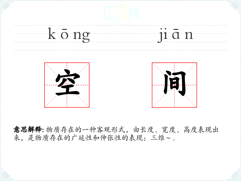 物质存在的一种客观形式,由长度、宽度、高度表现出来,是物质存在的广延性和伸张性的表现:三维~。