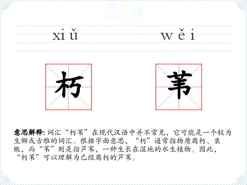 词汇“朽苇”在现代汉语中并不常见,它可能是一个较为生僻或古雅的词汇。根据字面意思,“朽”通常指物质腐朽、衰败,而“苇”则是指芦苇,一种生长在湿地的水生植物。因此,“朽苇”可以理解为已经腐朽的芦苇。