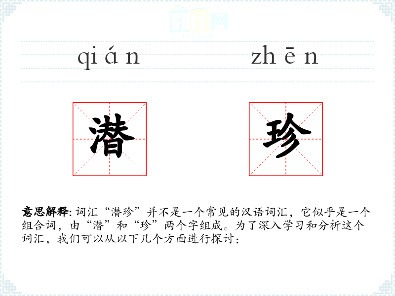 词汇“潜珍”并不是一个常见的汉语词汇,它似乎是一个组合词,由“潜”和“珍”两个字组成。为了深入学习和分析这个词汇,我们可以从以下几个方面进行探讨:
